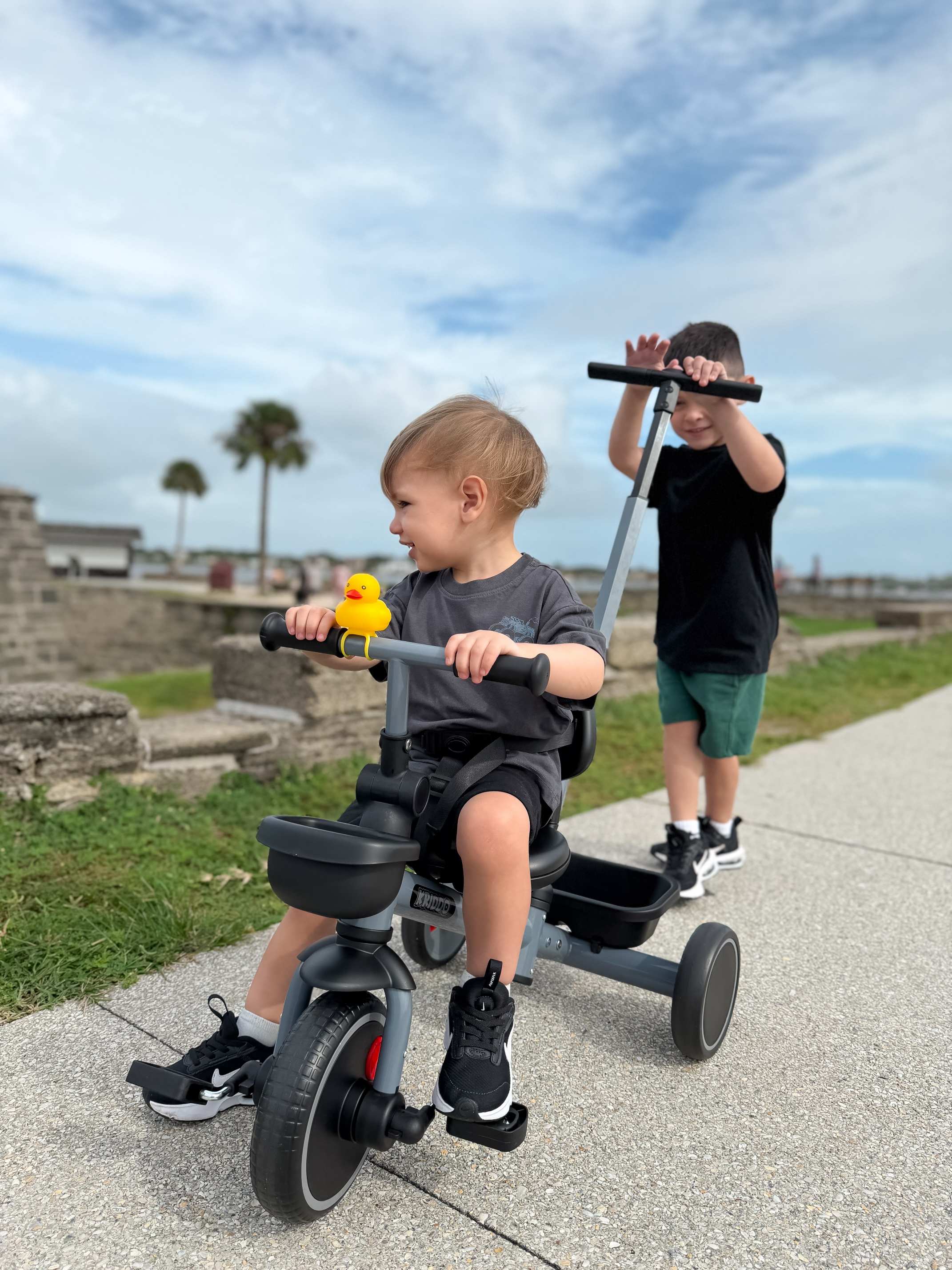 We appreciate the trike’s versatility over various terrains. It handles carpet, grass, pavement and wooden floors all with ease. The shock-absorbent wheels make for a quiet ride, which is especially nice if kids are riding around indoors.