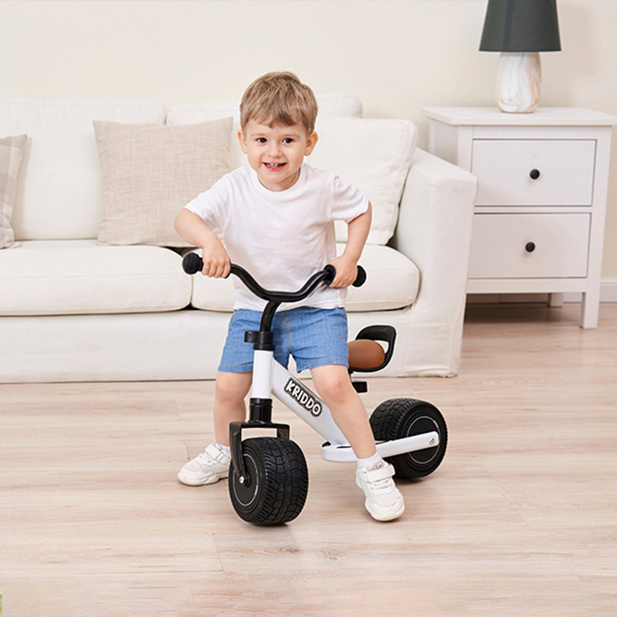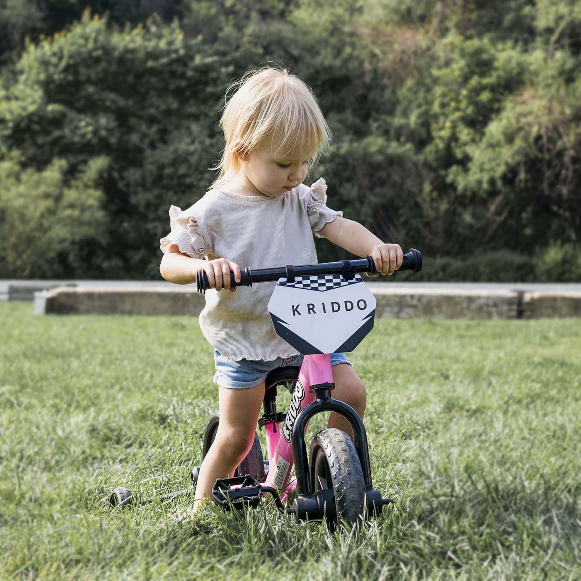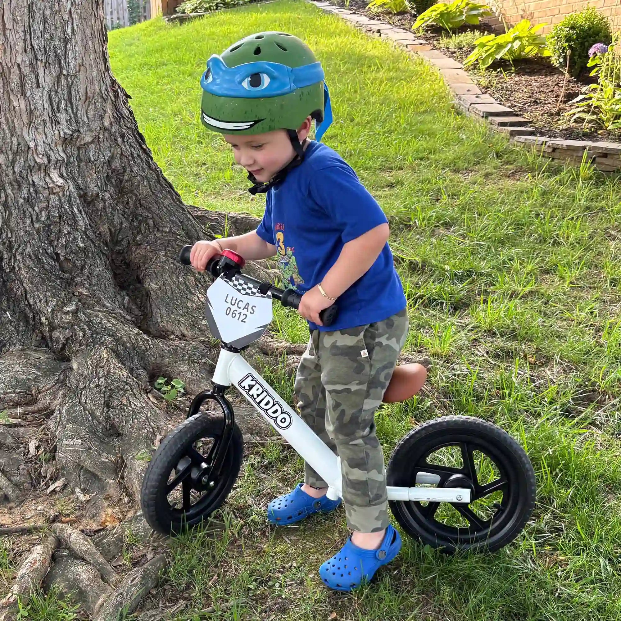 The KRIDDO Toddler Balance Bike boasts a sturdy frame, a footrest to teach toddlers to pick up their feet, and durable all-terrain tires that glide along surfaces from grass to pavement.