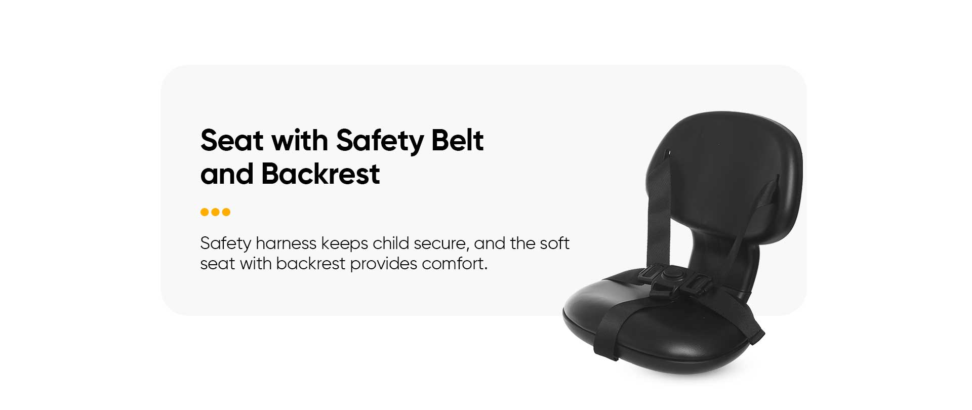- Three-point harness with padded seat and supportive backrest offers both comfort and security.
