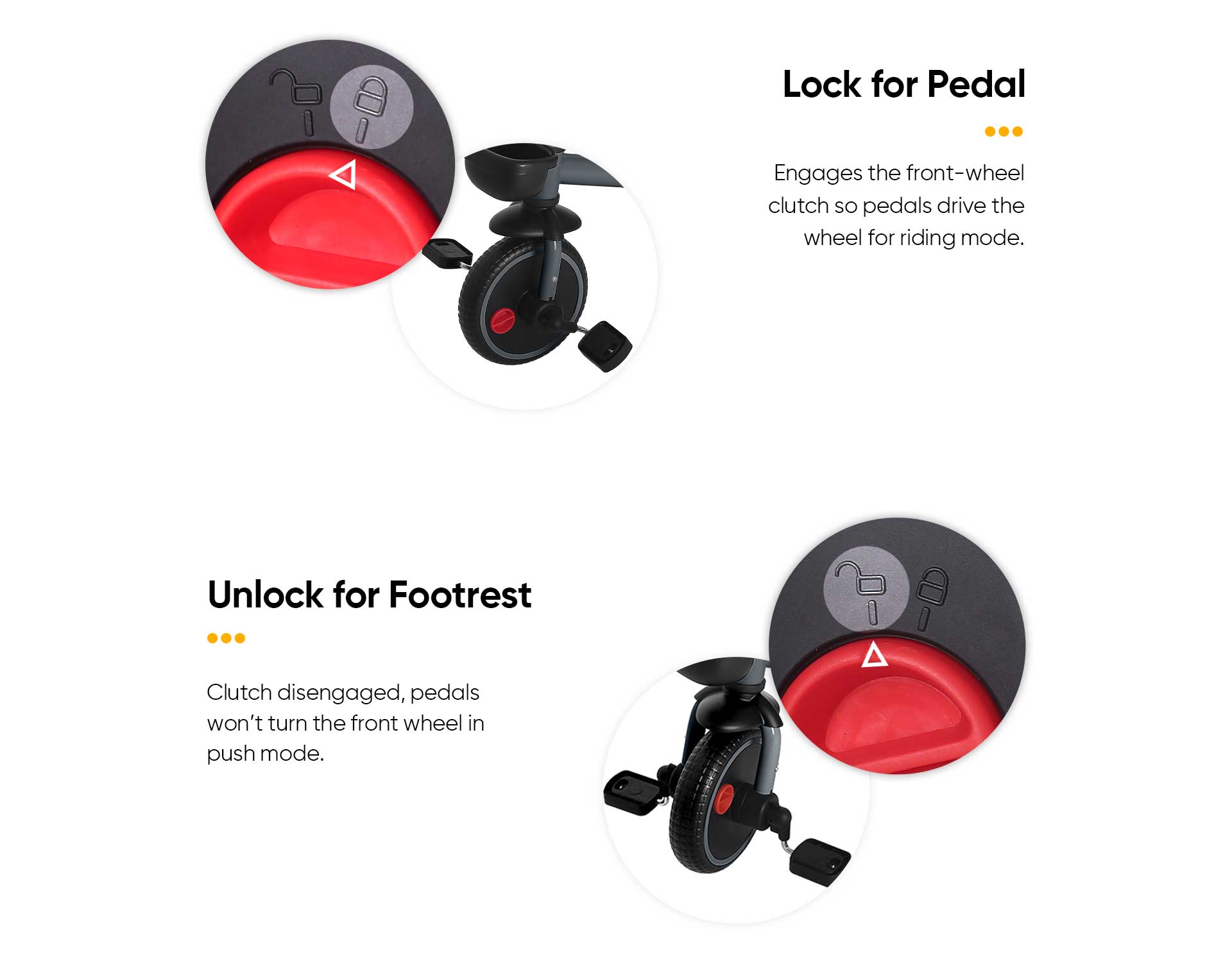 - Front wheel clutch lets riders switch easily between pedaling and pushing modes without resistance.