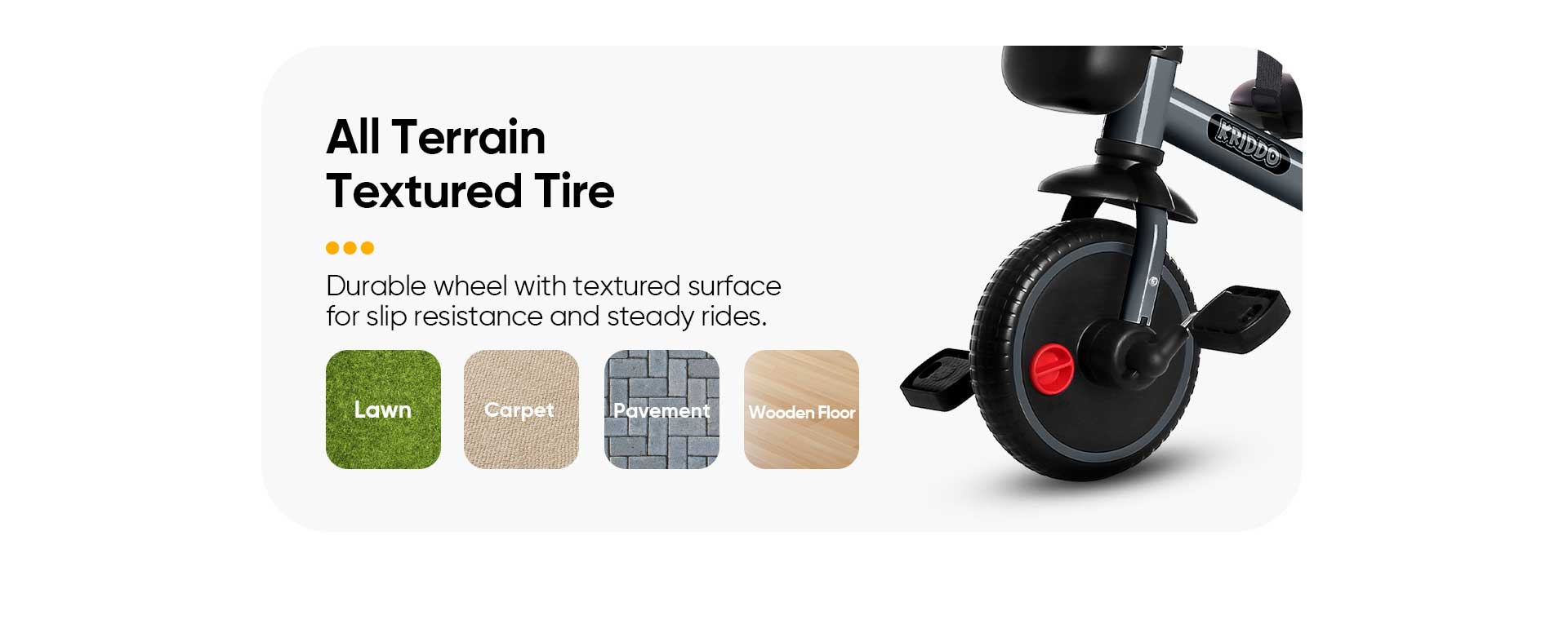 - All-terrain wheels with tread pattern improve traction on various surfaces and extend durability.
