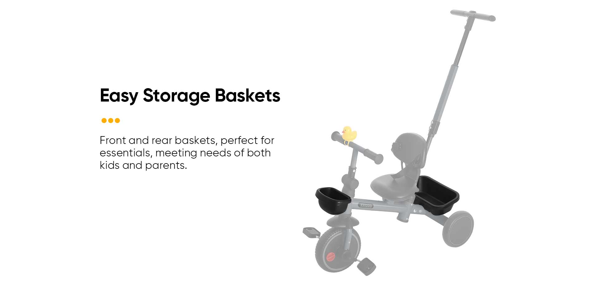 - Dual storage basket in rear make it easy to carry toys, snacks, and essentials.