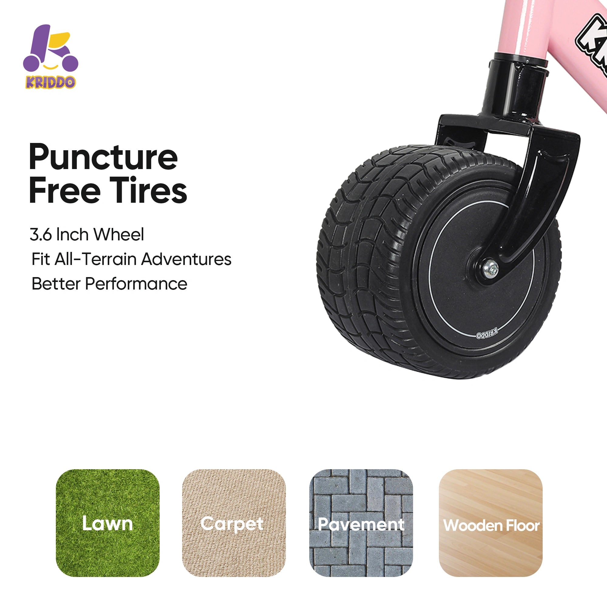 The baby balance bike uses extra-wide 3.6" wheels for better balance and grip on all terrains.