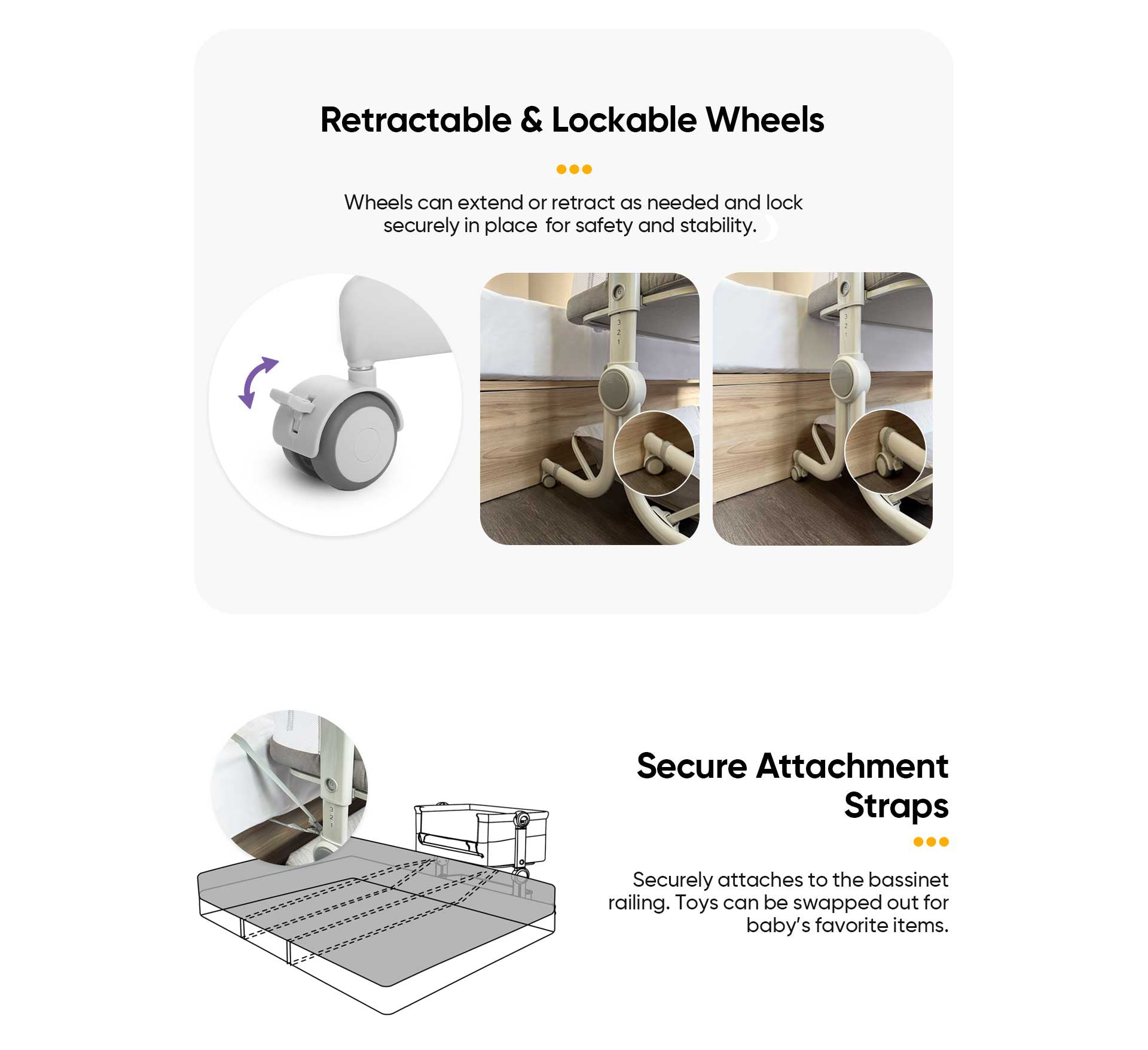 - Lockable wheels keep the bedside sleeper crib stable and prevent sliding